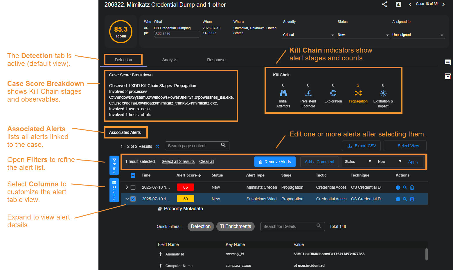 The Detection tab is the default display for the Case Detail view – it's what you see when you first open the Detail view of a case. From here, you can get a high-level summary of the case, including a breakdown of what Stellar Cyber has seen and why it is scoring the case the way it is. You can also see a summary of the XDR Kill Chain stages involved, and a table of Associated Alerts.