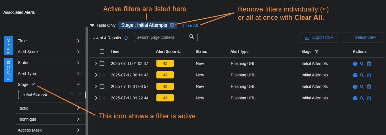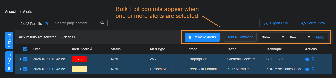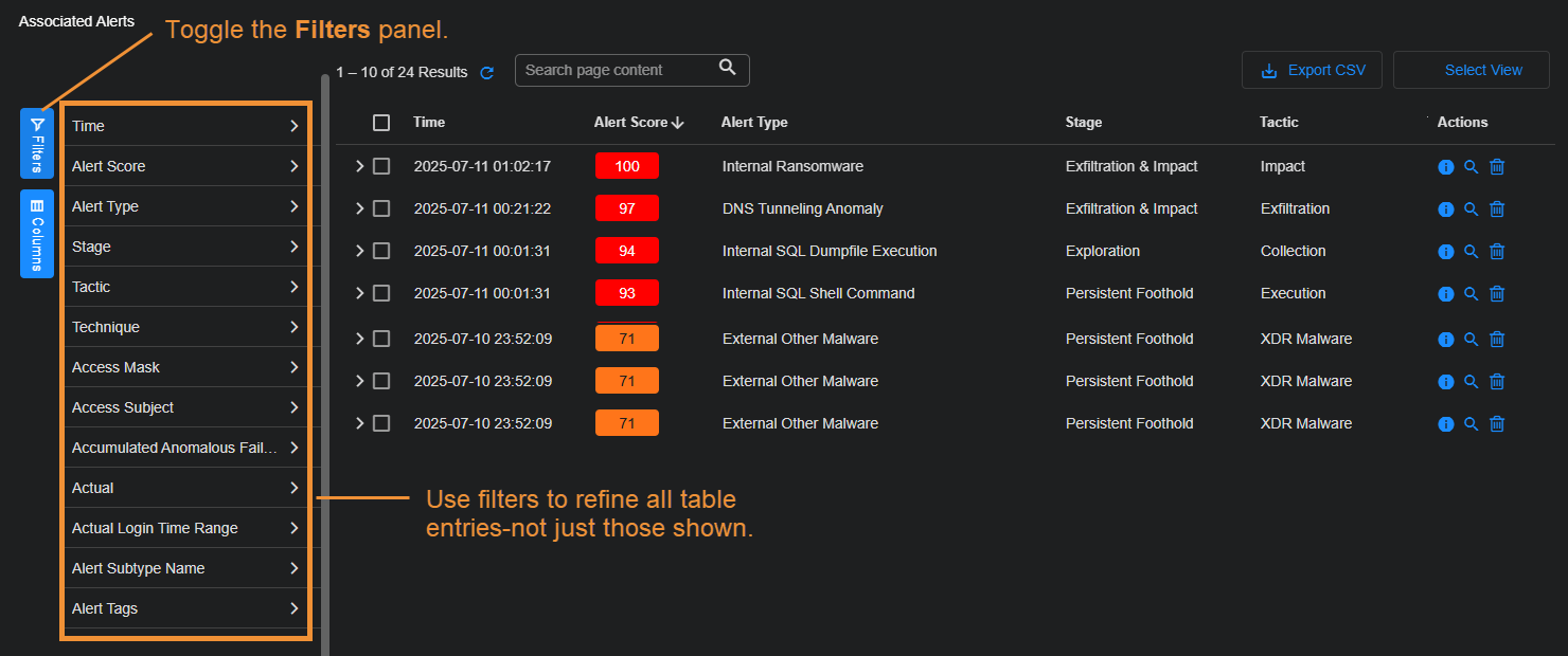 Export the contents of the Associated Alerts table to a CSV file using the Export CSV button.