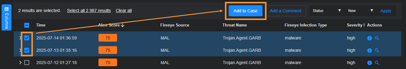 You can add alerts to a case manually from the Alert Details page. Select Detections | Alerts | View for an alert type, select one or more alerts in the table, and then select Add to Case to either create a new case or fadd them to an existing case.