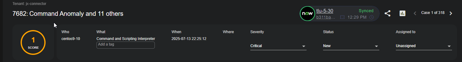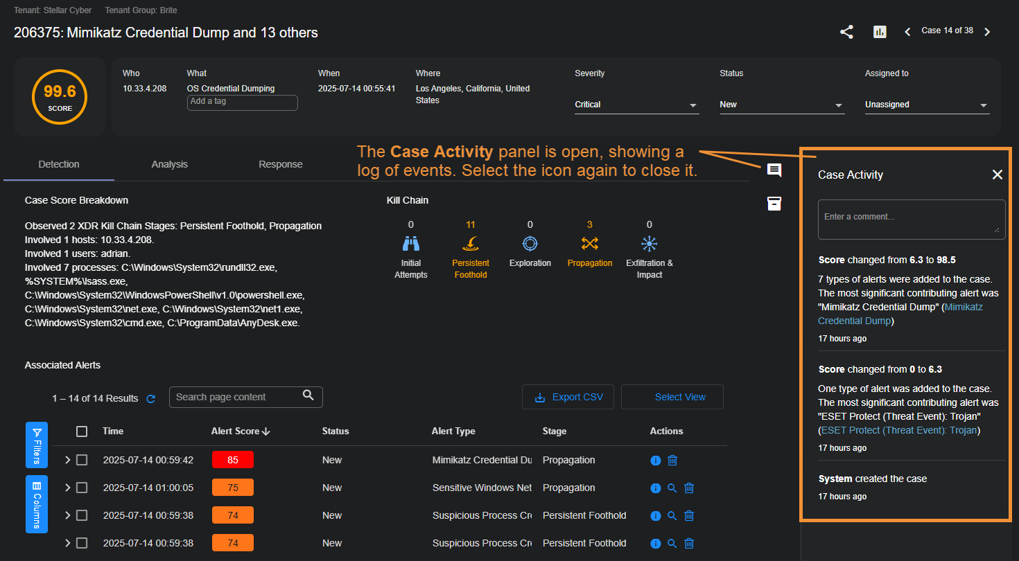 Case Activity – The Case Activity panel provides an audit trail for the case, chronicling any changes made to its associated alerts, Score, Severity, Status, Resolution, Assignee, Tags, or Description, in addition to any synchronization events with third-party applications such as ServiceNow via a Stellar Cyber InSync. You can also add your own comments to the Case Activity panel, helping you annotate changes made during the investigation of a case. Comments are viewable by all users, but can only be edited or deleted by the user who created them. Changes to comments also correspondingly update the Last Modified date for the case.