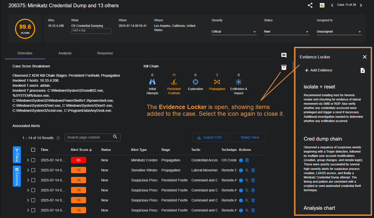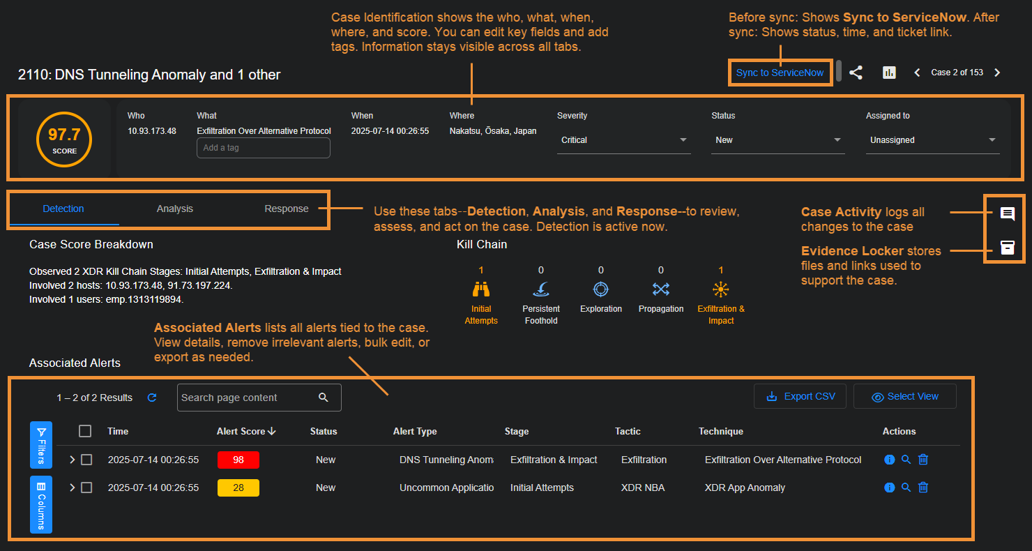 Detection Tab – The Detection tab provides a high-level summary of the case, including a breakdown of what Stellar Cyber has seen and why it is scoring the case the way it is. You can also see a summary of the XDR Kill Chain stages involved, and a table of Associated Alerts.