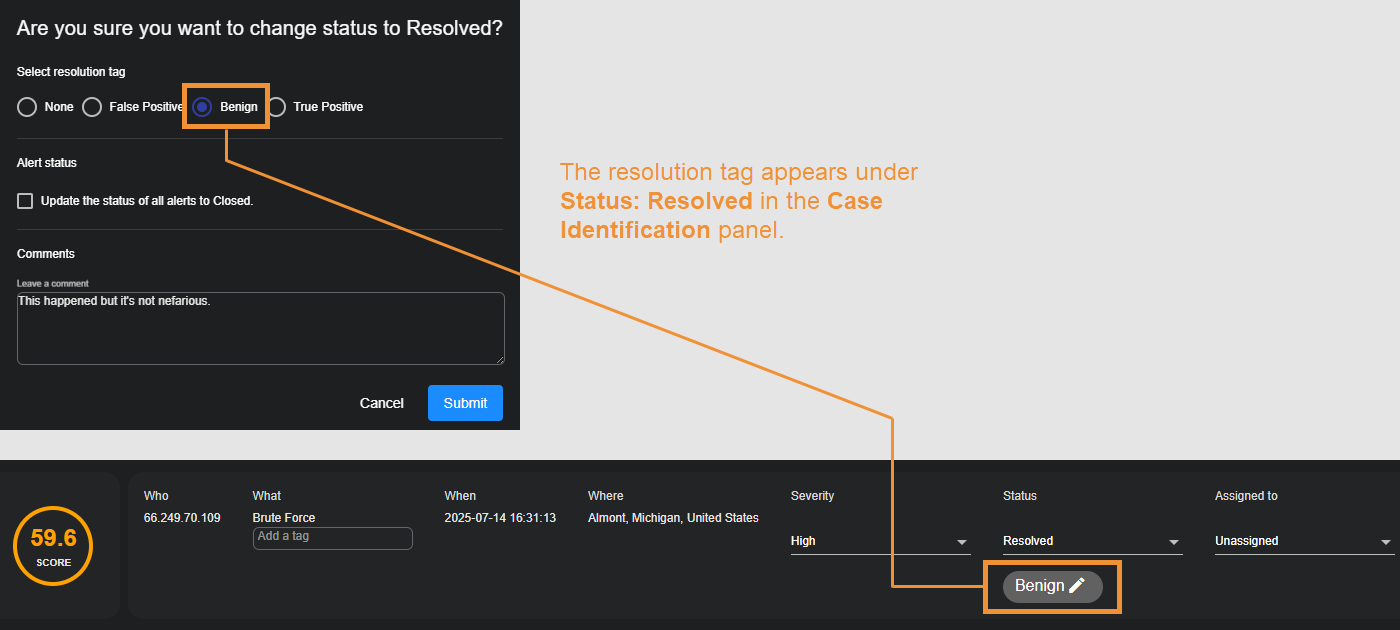 When you set the Status of a case as Resolved, a dialog box appears that lets you select a tag describing how the case was resolved. Once applied, the tag appears as a special graphic indicator in the Case Identification panel. The figure below summarizes this:
