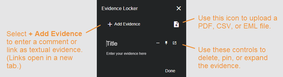 to pin a particular piece of evidence to the top of the Evidence Locker's list. Once evidence has been pinned, its pin icon changes color. Select the pin button again to unpin the piece of evidence. Pinned evidence is sorted by the time at which it was pinned, with the most recently pinned evidence at the top. -