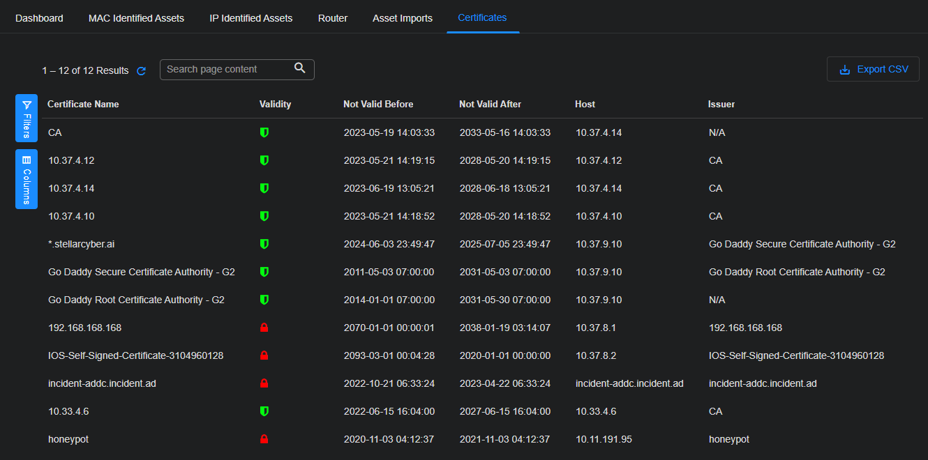 Stellar Cyber sensors routinely monitor certificates by observing network traffic. This page lets you quickly find invalid or expired certificates. Select the Certificates tab on the Assets | Asset Analytics page to view a table similar to the following.