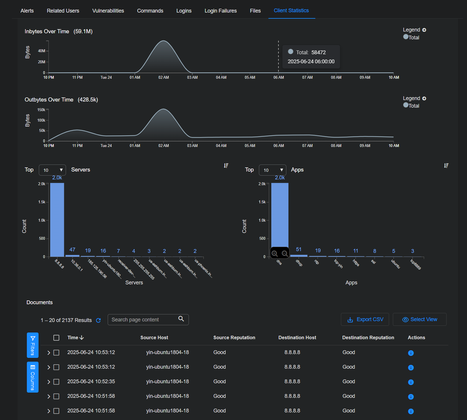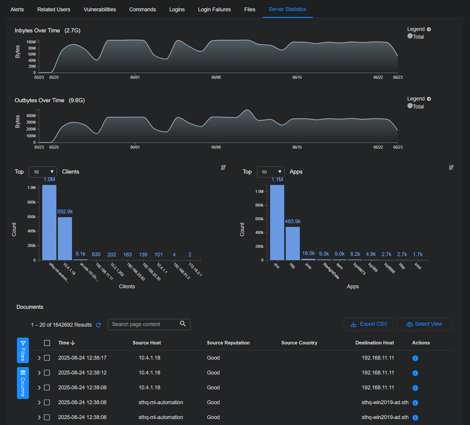 You can also view a table at the bottom of the Asset Details page listing associated Alerts, Related Users, Vulnerabilities, Commands, Logins, Login Failures, Files, and Server Statistics for the current asset. Keep in mind that the entries in these tables are all filtered by the global Filter settings at the top of the page (Alert Score, Sensor, Time, Tags, and so on).