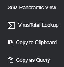 • Copy as Query – Copies a pre-built Lucene query that searches for related activity involving the IP address of the asset across multiple fields. Use this query in tools like Threat Hunting or Search to investigate communications where the IP appears as source, destination, or host.
