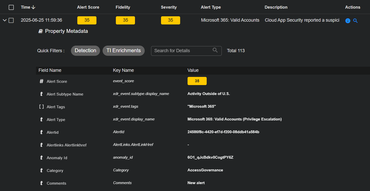 To see details about an alert, select More Info at the far right of the record. The Details panel appears with multiple sections: Key Fields, Cases, Details, JSON, and Actions.