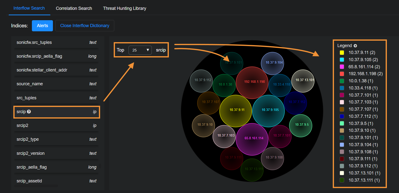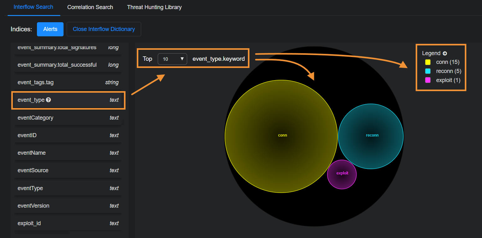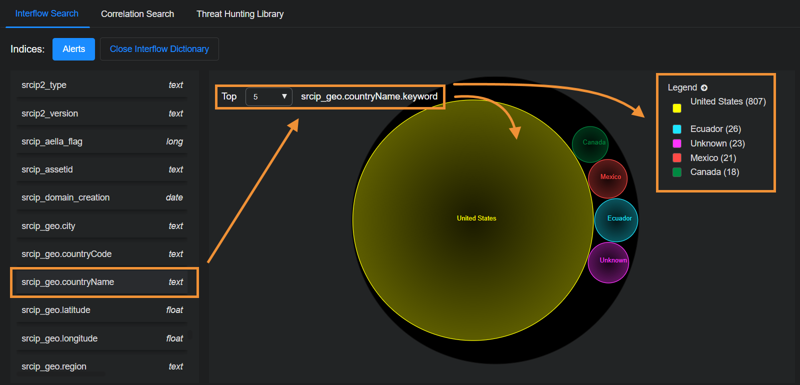 Explore the Interflow dictionary to find specific field values within indices. Use this tool to accurately query values in fields such as source IP address reputation, geo-location, and event status, enhancing dashboards and filters for threat detection.