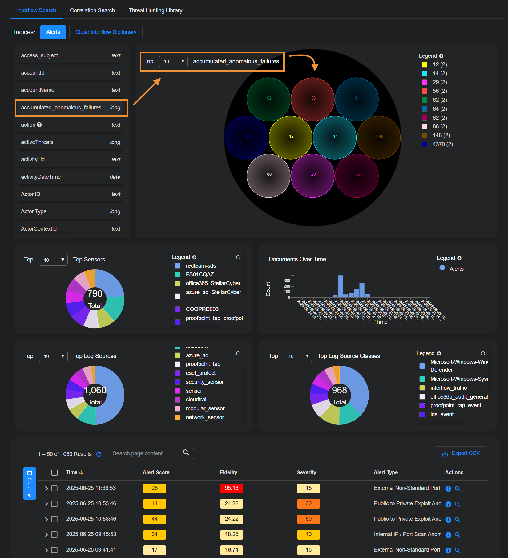 The most important control on this screen is the Indices selector. The Stellar Cyber data lake supports the following indices: