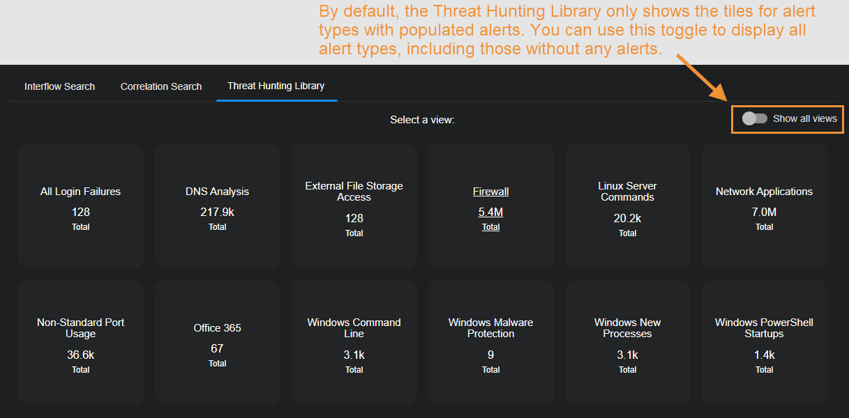 By default, the Threat Hunting Library only displays tiles for alert types that are populated with alerts. As illustrated below, you can use the Show all views option to toggle the display between showing all alert types and only those populated with alerts. ![]()