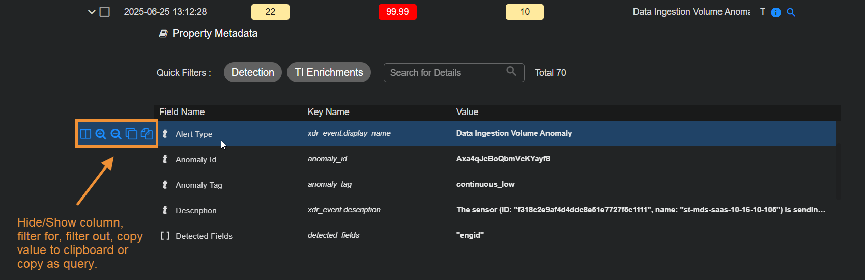 Copy as query – Copy a pre-built Lucene query that searches for related activity involving the field value. Use this query in tools like Threat Hunting or Search to investigate communications where the field value appears.