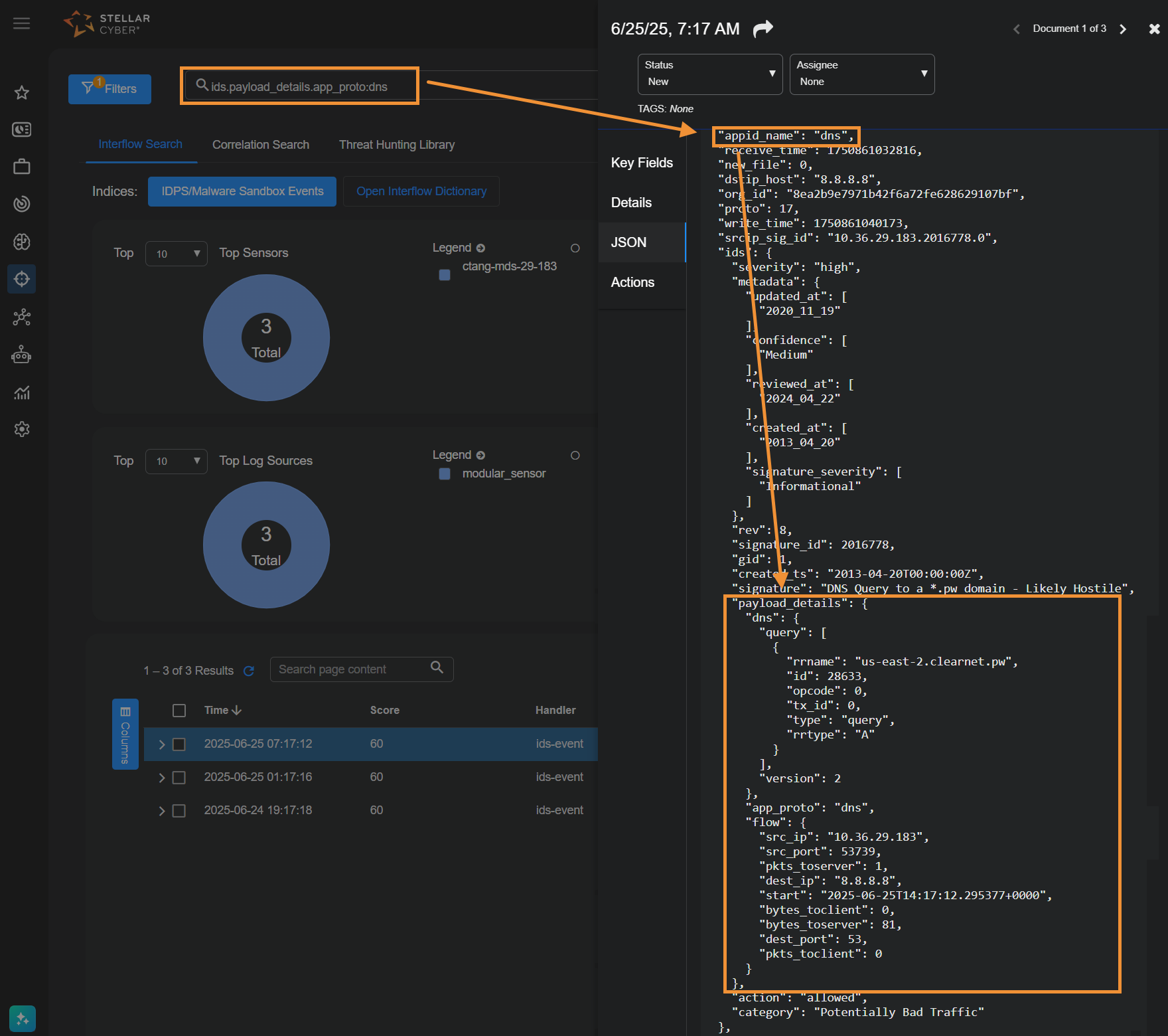Following is an example search for IDS records with payload data. The payload feature is supported with http and dns, so the query searches for just this feature in these types of applications.
