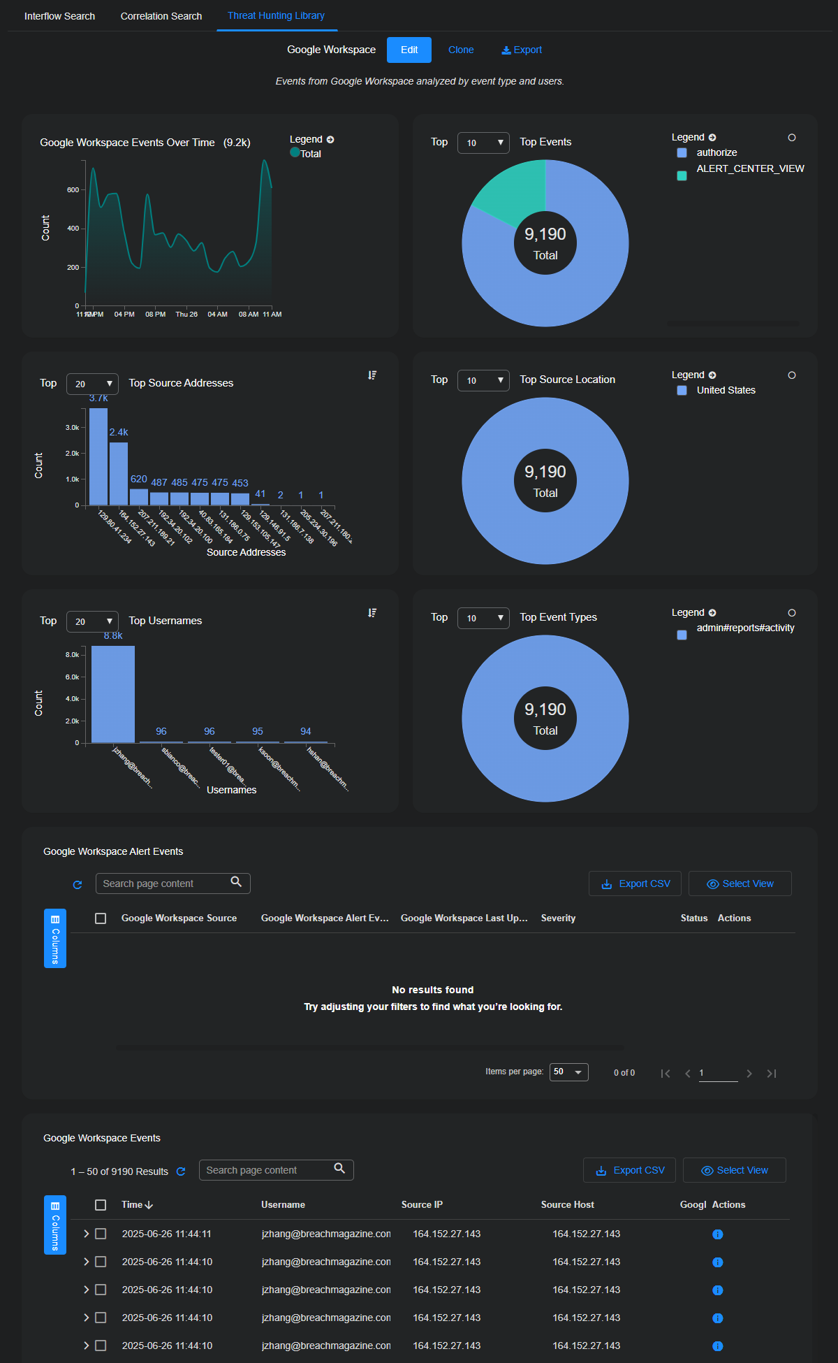 For Google Workspace, the tables are Google Workspace Alert Events and Google Workspace Events.
