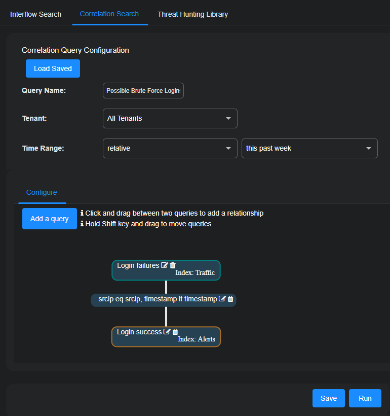To run the correlation query configuration that you made at a later time, select Threat Hunting | Correlation Search | Load Saved, choose it in the Select Pre-Defined Template list, and select Submit and then Run.