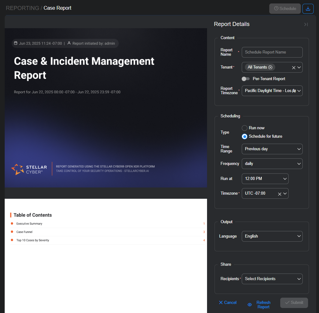 To generate a Case Report or Executive Summary, select its name. Stellar Cyber immediately generates a new PDF report for data gathered the previous day.