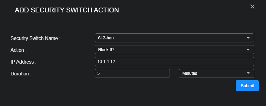 Choose a switch from the Security Switch Name drop-down menu, which includes all the security switches configured in your Stellar Cyber Platform.