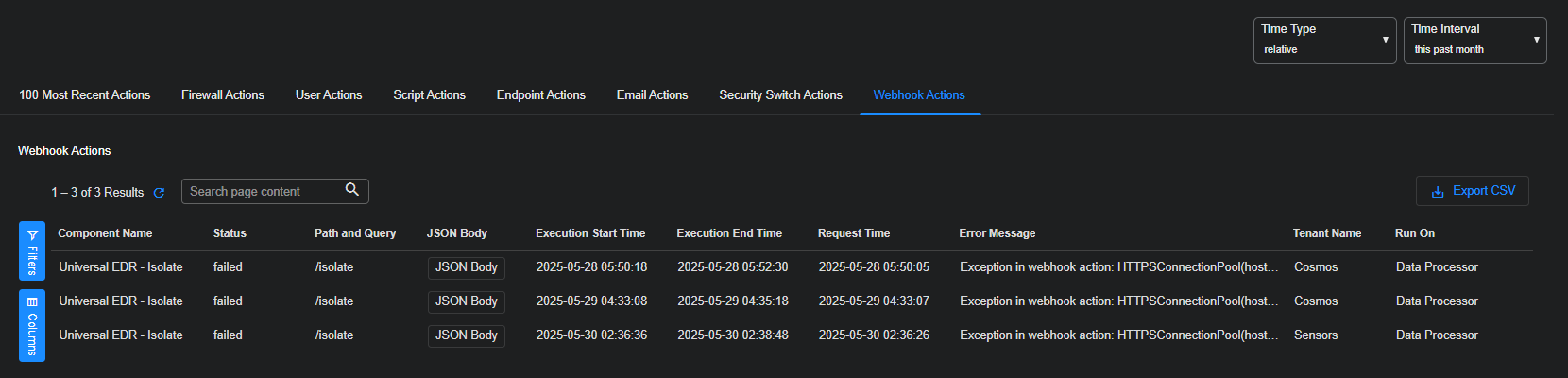 The actions are specified manually from the Event Display or automatically by Automated Threat Hunting. Use the columns to reveal more information about the action itself.