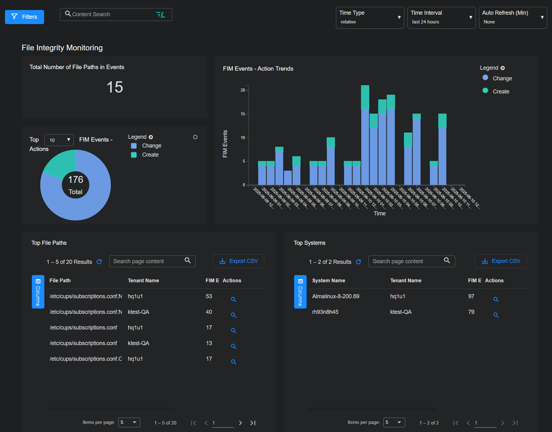The File Integrity Monitoring dashboard breaks out FIM events in the following charts and tables. Note that all charts and tables are based on the FIM events included by the current