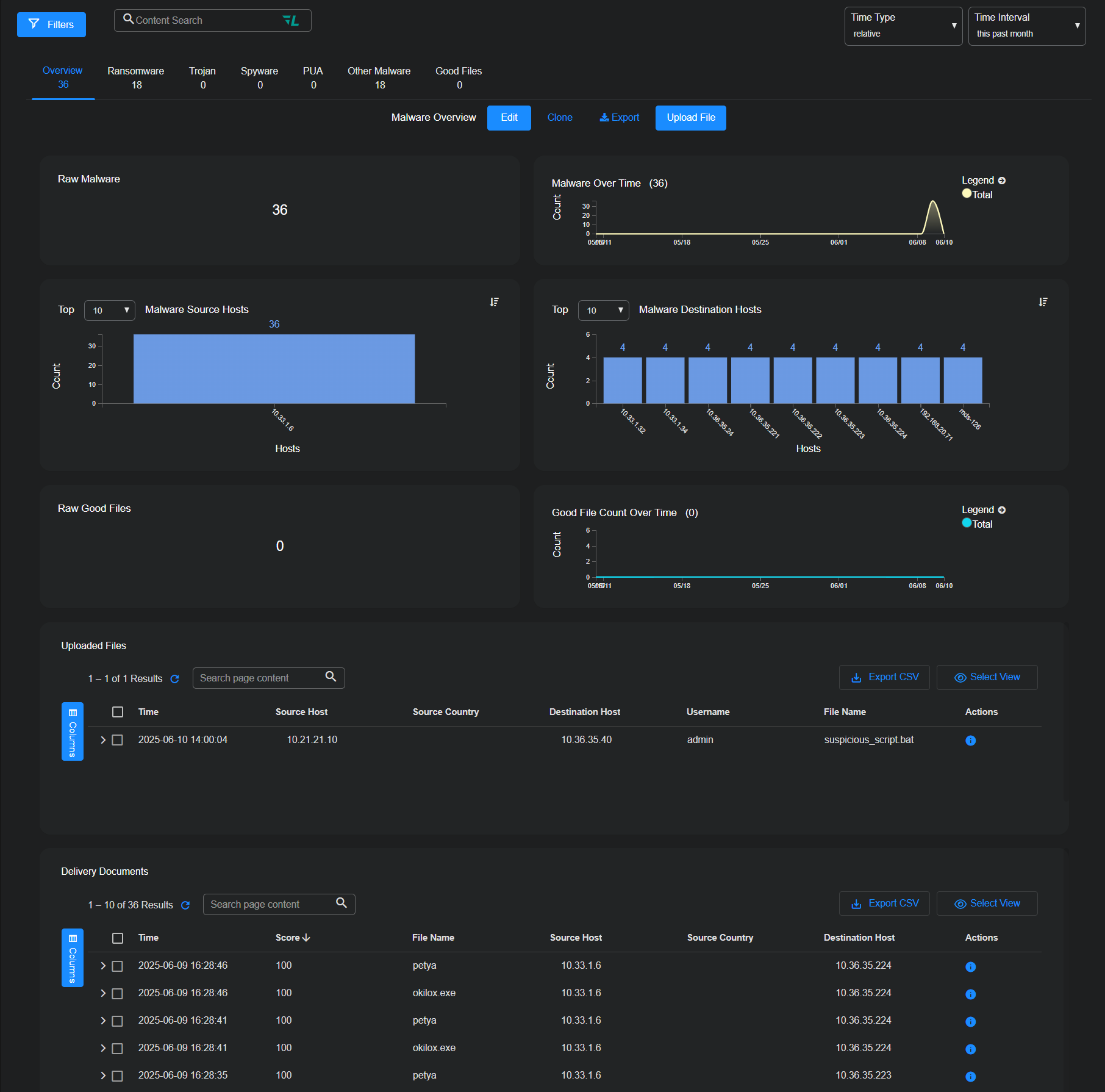 Stellar Cyber sensors can identify malware traveling through the network and arriving at specific hosts. You can use the Dashboards | PREDEFINED | Malware Sandbox Overview page to see and analyze these observations. Use the category tabs at the top of this page to filter for specific malware types; the tabs have a count of event records for that category.