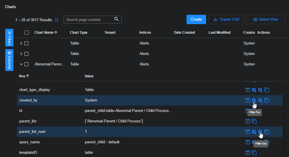 The charts list, like many tables in Stellar Cyber, supports export, sorting, edit, and delete operations. You can filter which charts to display based on chart attributes. Expand a row, select an attribute, and then select a filter based on whether you want to view charts that include the attribute (Filter For) or if you want to view charts that exclude it (Filter Out).
